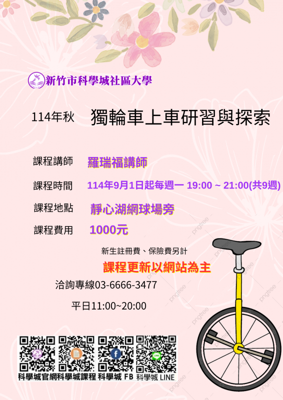 | 科學城社大簡介/課程介紹 | 一.介紹科學城社大教學理念,瞭解科學城社大成立與宗旨。 二. 講師及學員自我介紹。 三. 獨輪車課程說明,運動傷害防護。 |