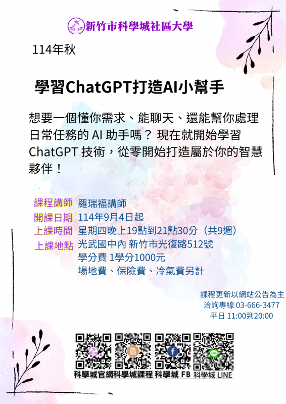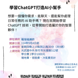 | 科學城社大簡介/ChatGPT說明與操作 | 一.介紹科學城社大教學理念,瞭解科學城社大成立與宗旨 二.ChatGPT註冊在不同設備間使用。 |